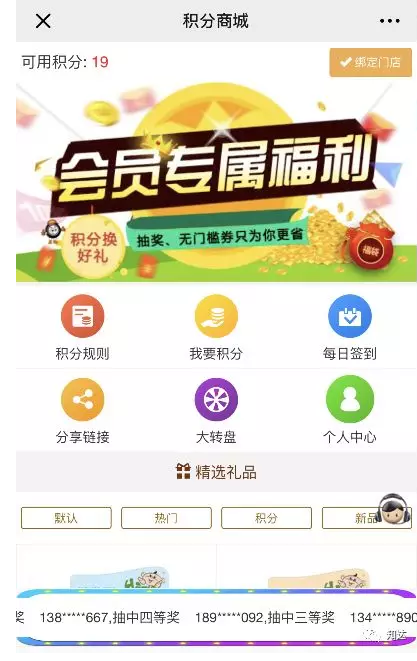 積分商城首頁展示可用積分、積分規則、我要積分、每日簽到、分享鏈接、大轉盤、個人中心。