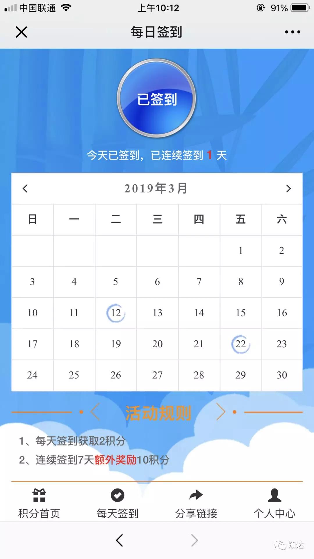 點擊【每日簽到】進入以上界面,每天簽到也可獲得相應積分。 |
