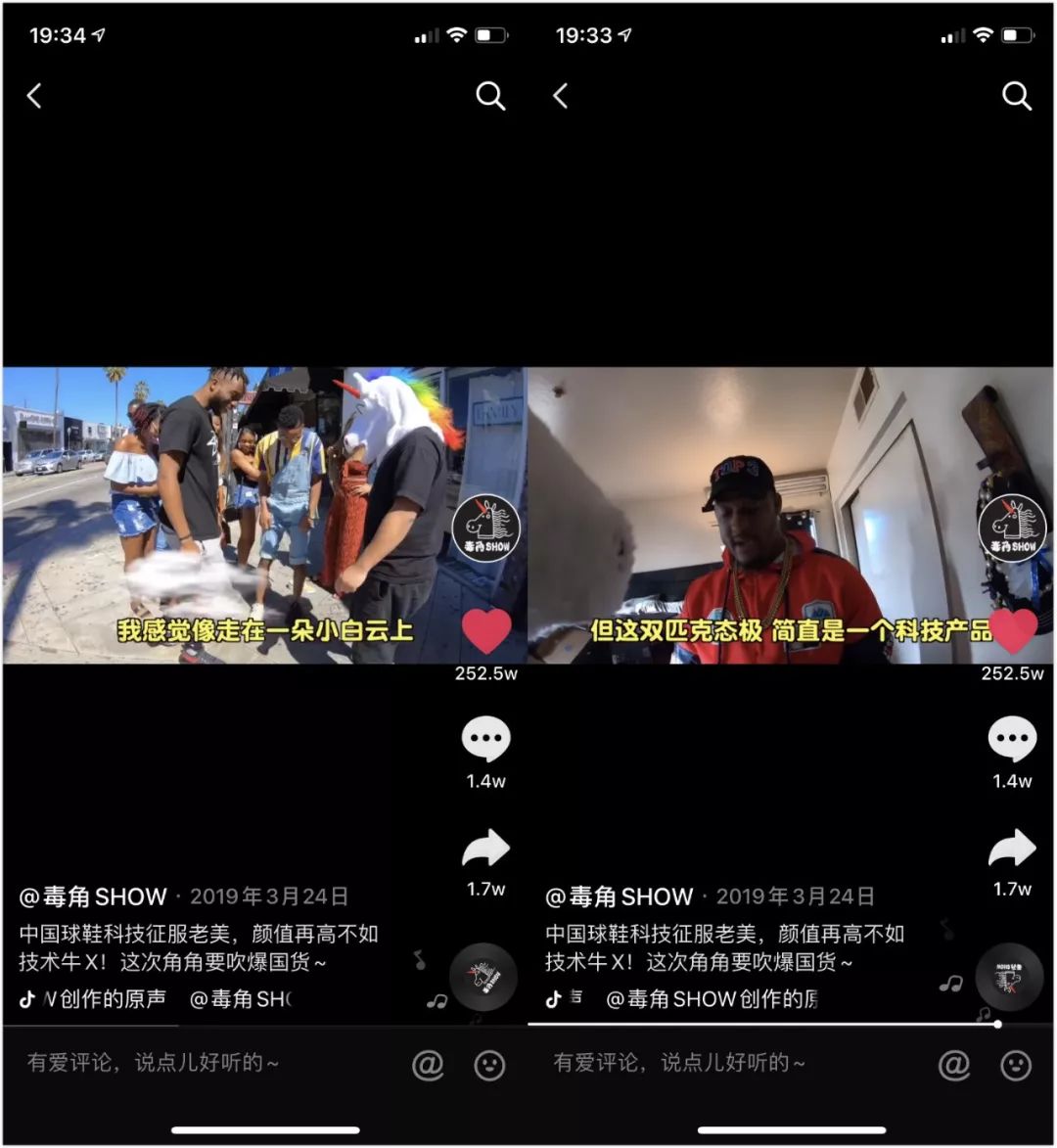 勢頭起來后,再安排運動、好物、國貨接力助推,同時抖音上鞋類大號同步測評,而微博則在搬運中起到延長傳播。 憑著國貨科技火到國外這一策略,毒角SHOW個人在抖音、微博、騰訊視頻等多個平臺總共帶來1440萬播放,抖音252萬點贊量達到其歷史第一,實際帶貨效果非常好,當然態極產品本身的產品力也是根本。 出口轉內銷的策略有時也需要針對品類做具體措施。匹克態極籃球鞋戰役中,贊意策劃再次邀請毒角SHOW合作,先是美國鞋王店長(中國90后)買入態極籃球鞋并高價出售,后讓毒角SHOW到店內做采訪,道出鞋王賣態極是因為認可態極的產品力,認為中國終于有抗衡國外品牌的核心科技了,最后再在球場找球迷實際眾測大獲專業好評……當期毒角SHOW視頻獲得266萬點贊量火爆刷新其抖音記錄,結果就是態極籃球鞋銷售數據直線上升。 這一系列組合下來已經不是簡單的出口轉內銷了,實際是一條兼具國外權威銷售認可+產品溢價能力+受眾專業眾測的策略,產品好+國貨爭光的戰狼體宣傳之下帶貨效果不言而喻。 所以出口轉內銷的種草和拔草,關鍵是點要找好-梗要埋巧-引爆要騷。