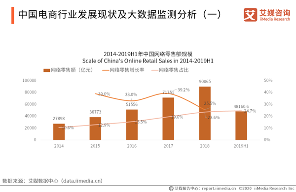 中國電商行業發展現狀及大數據監測分析(一) iiMedia Research(艾媒咨詢)數據顯示,中國網絡零售額在社會消費品零售總額中所占比重逐年上升,2019年上半年,中國網絡零售額達48160.6億元,占社會消費品零售總額24.7%。艾媒咨詢分析師認為,自從電商行業在中國興起后,網購消費在人們生活中的重要性不斷提高,網購已成消費者消費重要渠道。