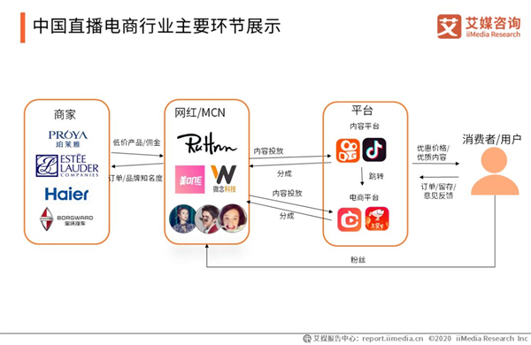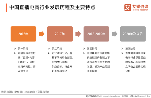 iiMedia Research(艾媒咨詢)數據顯示,2019年,中國直播電商行業的總規模達到4338億元,預計到2020年規模將翻一番。艾媒咨詢分析師認為,隨著互聯網技術的發展,以直播為代表的KOL帶貨模式給消費者帶來更直觀、生動的購物體驗,轉化率高,營銷效果好,逐漸成為電商平臺、內容平臺的新增長動力。 報告核心觀點 中國直播電商行業的快速發展,與傳統電商模式對比優勢突出 2020年,中國直播電商交易規模預計達到9160億元;相對于其他電商模式,直播電商具有傳播路徑更短、效率更高等優勢,同時商家、平臺、主播和消費者四方都將受益于直播電商模式。 相對于傳統電商模式,直播電商模式在產品呈現形式、時間成本、社交屬性、購物體驗感和售賣邏輯多個維度都具有顯著的優勢。但直播電商的本質還是電商,不是近年新生的媒介渠道,投資界應避免投資誤區。 電商平臺+直播,直播平臺+電商,平臺直播帶動產品銷售額高速增長 目前中國布局電商直播行業的平臺主要分為兩大類,一類是電商平臺,通過開通直播間,引入內容創作者,直播電商是“電商+直播” ;一類是內容平臺,通過接入第三方電商平臺來布局直播+電商的運營模式,直播電商是“直播+電商”。 2019年雙11全天淘寶直播帶動成交近200億元,其中,億元直播間超過10個,千萬元直播間超過100個。“雙11”啟動僅63分鐘,淘寶直播帶動的成交額就超2018年雙11全天。 中國直播電商行業機遇與挑戰并存,是否成為行業風口仍處于觀望階段 批發電商的發展、明星試水電商直播、技術革命加碼等推動直播電商行業向前發展。 直播電商行業發展紅紅火火的同時,也暴露出一些發展短板,比如數據造假、內容同質化、頭部主播難以復制、品牌商與主播雙方的博弈等等。 iiMedia Research(艾媒咨詢)數據顯示,有27.21%的受訪用戶看好直播電商的未來發展,46.26%的受訪用戶持中立/觀望態度,直播電商是否是電商行業下一個風口仍處于觀望階段。 以下為報告節選內容 行業背景概況(節選): 中國直播電商行業發展歷程及主要特點 中國直播電商最早可以追溯到2016年,彼時,直播電商伴隨直播的風口誕生,而且發展的初衷很簡單,只是為了提高用戶在平臺的停留時間。經過4年的發展,中國走過了直播電商的初創期、發快速發展期,未來還會往成熟期的道路持續發展下去。