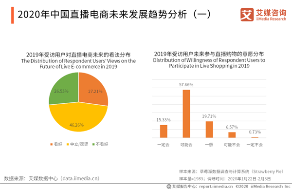 行業趨勢分析(節選): 2020年中國直播電商未來發展趨勢分析(一) iiMedia Research(艾媒咨詢)數據顯示,有27.21%的受訪用戶看好直播電商的未來發展,46.26%的受訪用戶持中立/觀望態度,26.53%的受訪用戶不看好直播電商。此外,從未參與過直播購物的受訪用戶中,超過半數表示未來可能會參與直播購物,15.33%的用戶表示一定會參加。艾媒咨詢分析師認為,雖然當前直播帶貨十分火爆,但直播電商是否是電商行業下一個風口,大部分人還持觀望態度。