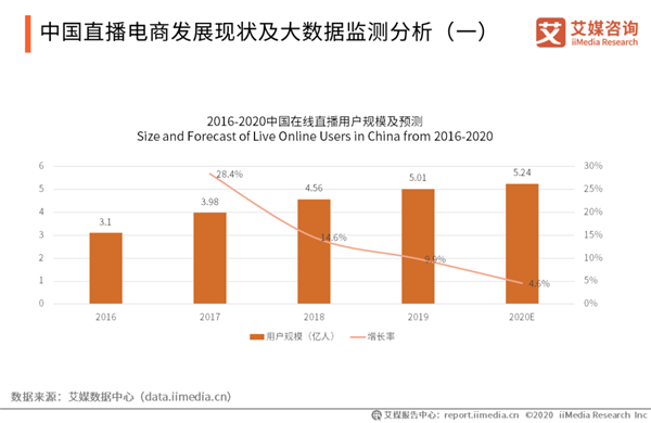 市場數據分析(節選): 中國直播電商發展現狀及大數據監測分析(一) iiMedia Research(艾媒咨詢)數據顯示,到2020年中國在線直播用戶規模將達到5.24億人,涵蓋了游戲直播、秀場直播、生活類直播、電商直播等,說明觀看直播逐漸成為人們的上網習慣之一。艾媒咨詢分析師認為,龐大的直播用戶體量是直播電商行業進行商業變現的前提之一。