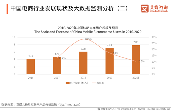 中國電商行業發展現狀及大數據監測分析(二) iiMedia Research(艾媒咨詢)數據顯示,2020年移動電商用戶規模有望達到7.88億人,但增幅有所下降。艾媒咨詢分析師認為,隨著電商體系在中國已發展成熟,用戶規模逐漸觸達網民規模天花板,流量獲取成本也越來越高,以“直播+電商” 模式的興起有可能成為電商行業的下一個風口。