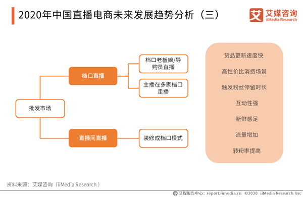 2020年中國直播電商未來發展趨勢分析(三) 艾媒咨詢分析師認為,對于專業批發市場來說,直播是增加銷售、彌補線下渠道不足的新模式,并不能取代原有的模式。因此,檔口直播的形式既可以保留傳統批發市場原有的現場氛圍,給線上消費者營造一種高性價比的消費場景,同時具有增加店鋪流量、提高轉粉率、延長粉絲停留時長等優勢。因此,檔口直播將會是直播電商一個非常重要的發展趨勢。