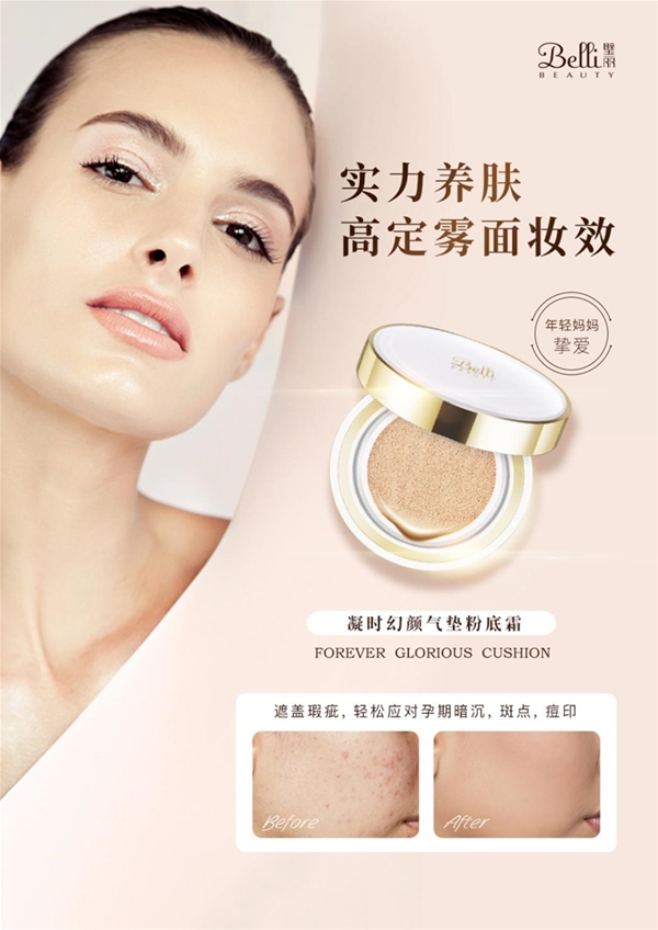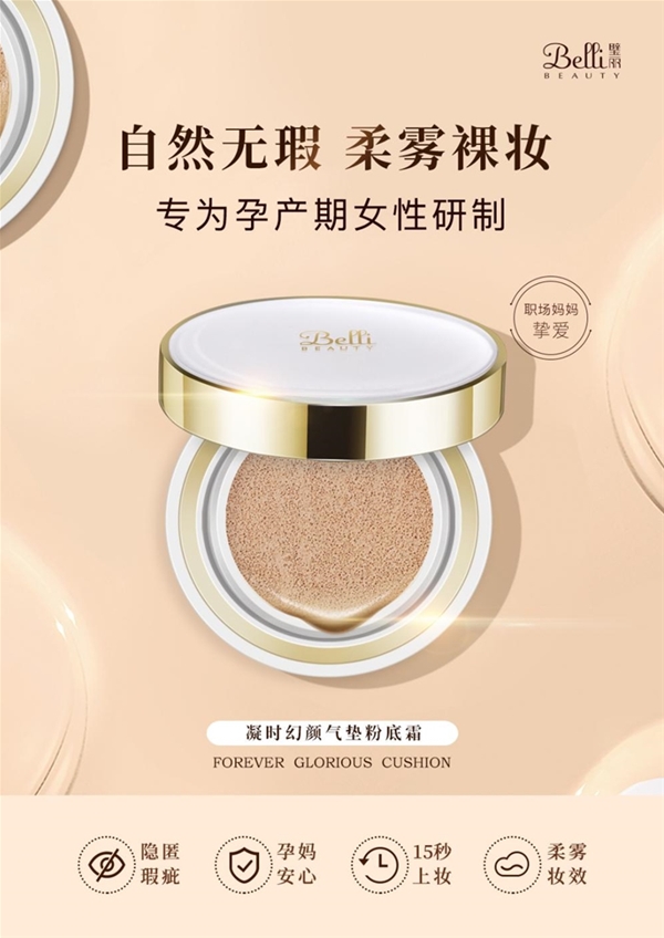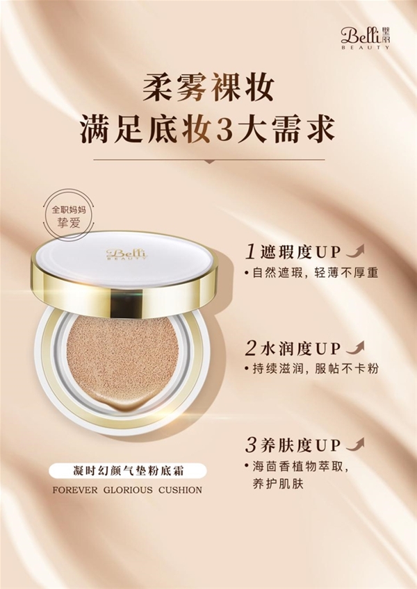 全職孕媽在選擇底妝產品上更為理性,Belli氣墊滿足底妝3大需求,遮瑕度up,水潤度up,養膚度up,蘊含法國珍稀保養成分—海茴香,上妝亦是養護肌膚。